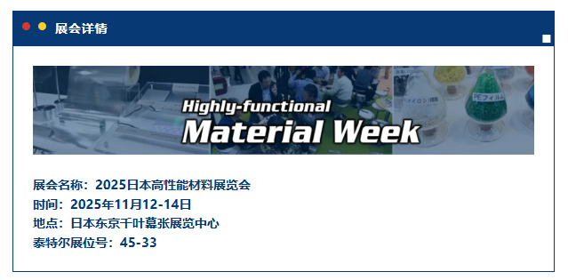 2025年11月12-14日,世界領先的先進材料展——東京高性能材料周(Highly-Functional Material Week)即將在日本幕張國際展覽中心盛大開幕。屆時,泰特爾將攜核心產品與創新解決方案精彩亮相,誠邀全球客戶與合作伙伴蒞臨蒞臨45-33號展位參觀交流。